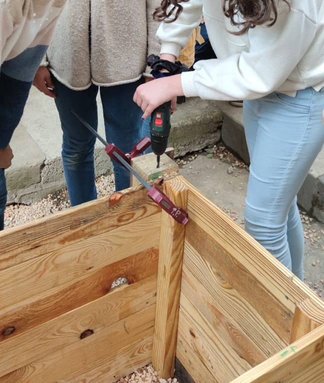 Notre association propose d’accompagner ce type de projet dès la phase de conception jusqu’à la phase de réalisation. Nous avons accompagné l’établissement dans l’aménagement de la zone prévue pour les bacs.